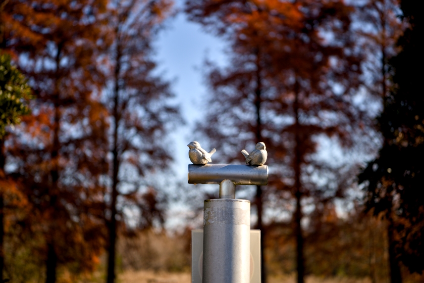 公園の入口にあった小鳥のオブジェが野鳥のメッカと言わんばかりですが、この時はまだ気づいていませんで、ただ背景の赤い木をボカしてやろうというくらいでした。