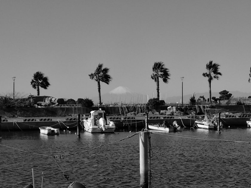 冬の透明な空気が気持ち良い雨上がりの晴天の日の散歩で、モノクロなので分からないと思いますが青空が美しく富士山が見えました。いつもであれば青空をそのまま撮るだけでお伝えできるところですが、モノクロなので、できれば想像しながら見ていただけると良いと思います。